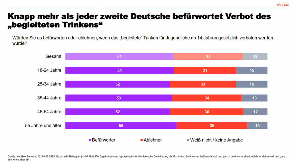 Die Debatte um den Alkoholkonsum unter Jugendlichen erhält neuen Auftrieb: Eine aktuelle YouGov-Umfrage zeigt, dass 54 Prozent der Deutschen die Abschaffung des sogenannten „begleiteten“ Trinkens befürworten würden. Sogar bei den 18- 24-Jährigen ist die Mehrheit dagegen.